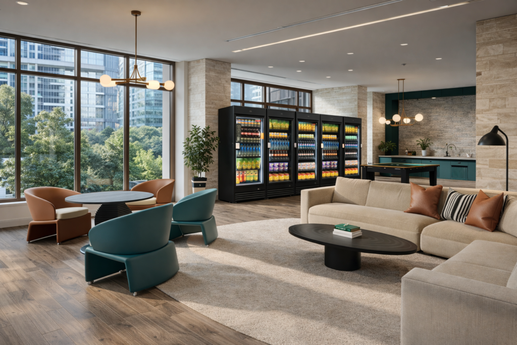 Stylish and accessible vending units providing quality refreshments for condo residents and guests.